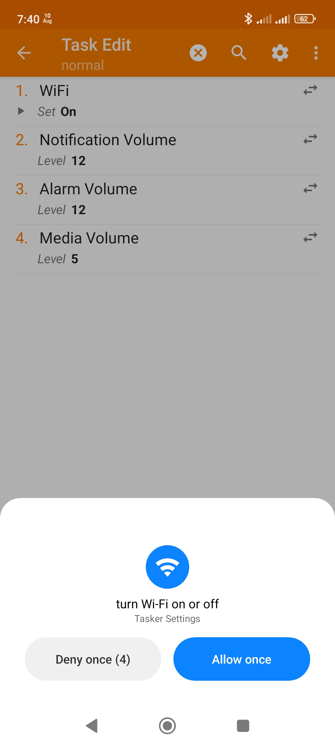 I'm having this issues to using Android 14 hyperos, it keeps prompting "allow tasker settings turn wifi on or off?", Bluetooth having the same issue, I need to manually confirm to turn it off