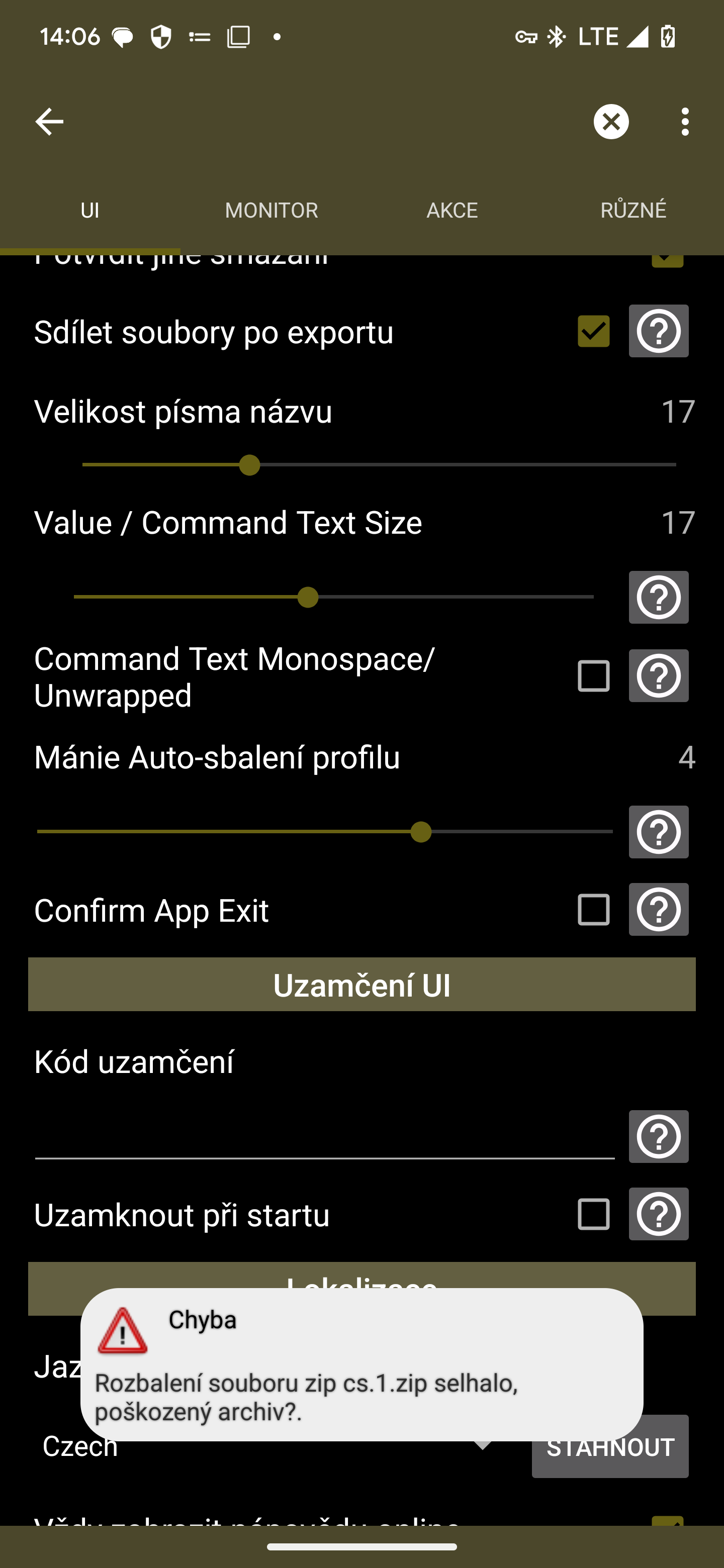 V otevřené aplikaci Tasker nelze v menu otevřít pomoc: gesta a ani uživatelská příručka. Oba dva výše zmíněné odkazy doprovází stejné chybové hlášení. Taktéž nelze otevřít v menu UI stáhnout jazyk češtinu a následně ho i použít . Jazyk se sice stáhne ale následně to hlásí chybové hlášení, soubor je poškozen. Zkoušel jsem stažený soubor jsem rozbalit jak v programu WinRAR tak v programu ZArchiv. Bohužel bezúspěšně v obou případech hlásí poškozený soubor z toho důvodu nelze rozbalit . V příloze zasílám screenshoty všech výše zmíněných problémů . Ještě dodám, ale tím si nejsem úplně jist, mám zaplacenou za verzi, ale zdá se mi, že nákup přes Obchod Play není obnoven i když nevykazuje žádné možnosti nákupu i tak se mi zdá, že je omezen. v příloze zasílám screenshot. Instalace je na Pixel 7 pro Android VanillaIceCream betaverze