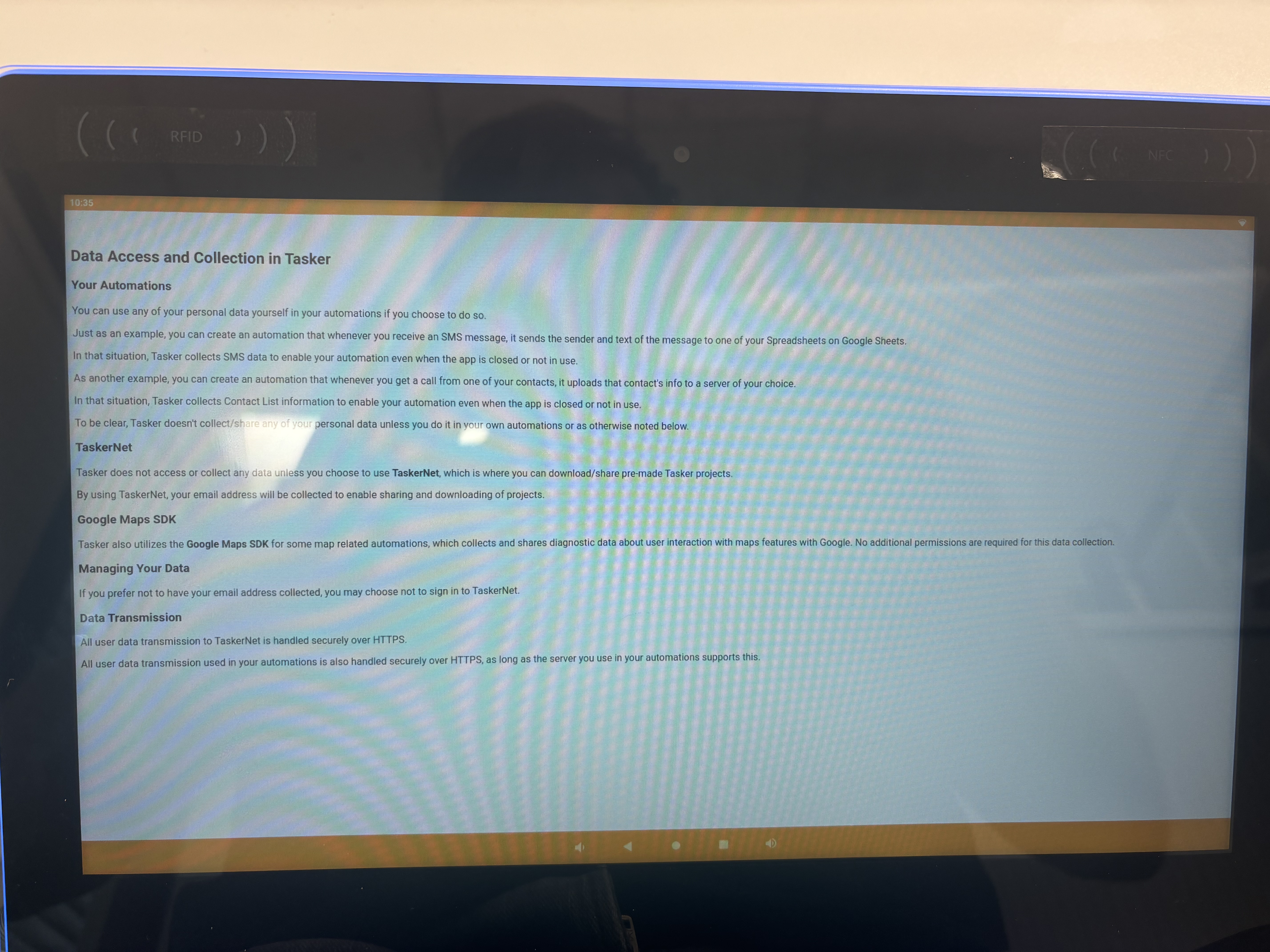 I bought Tasker, but I am unable to start it. When tasker is being started, then a full screen message opens with "Data Access and Collection in Tasker" and there is no button / option to continue to the app itself. Disabled notifications for Tasker, but no change. Using Android 10 tablet. How to proceed to the app itself?