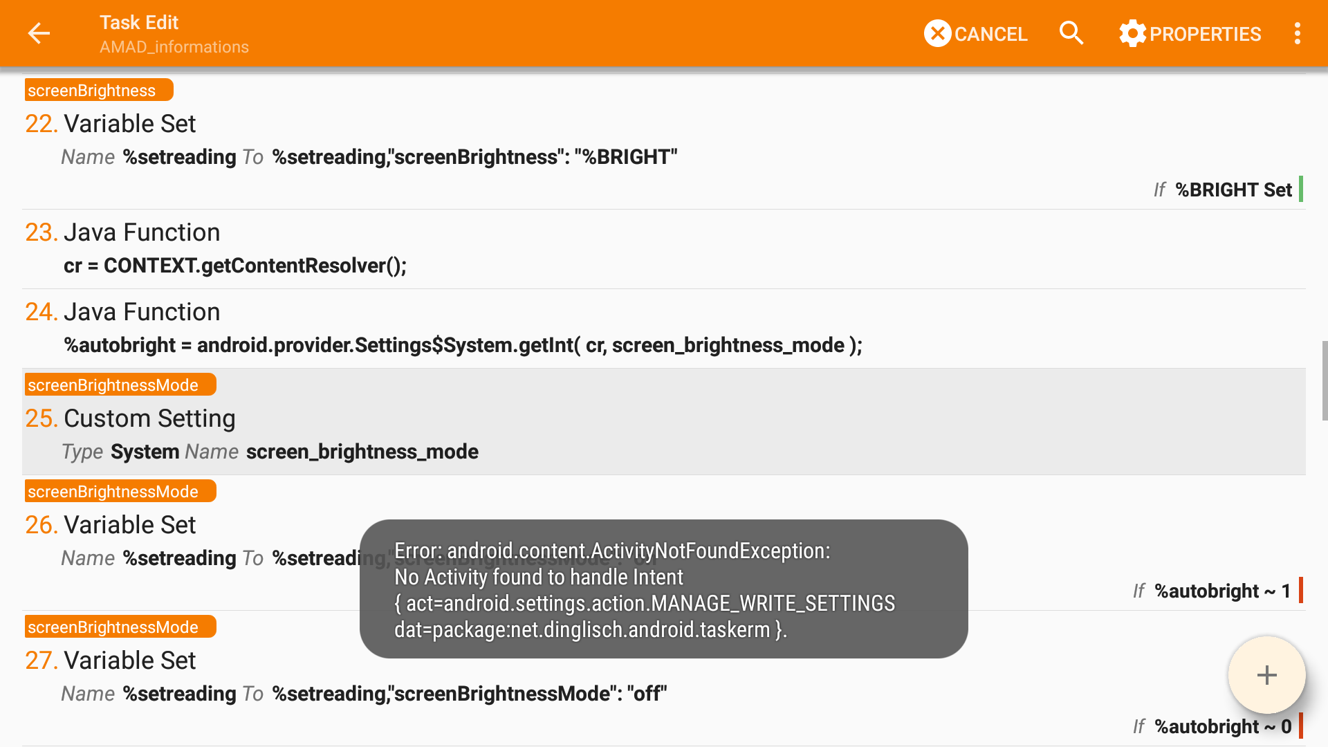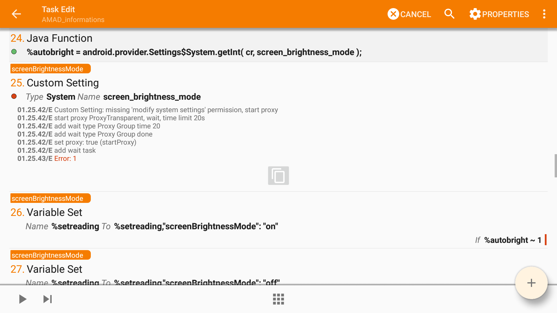 A1: Custom Setting [ Type:System Name:screen_brightness_mode Value: Use Root:Off Read Setting To:%autobright Continue Task After Error:On ]