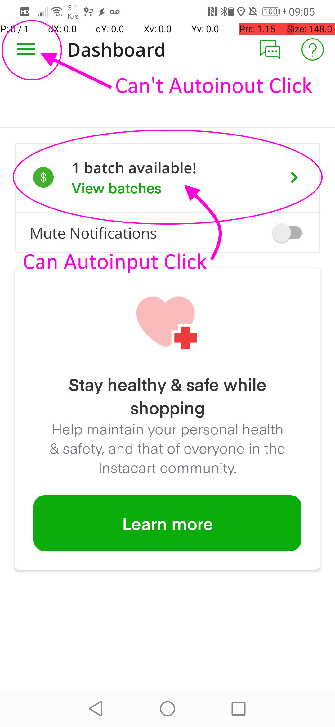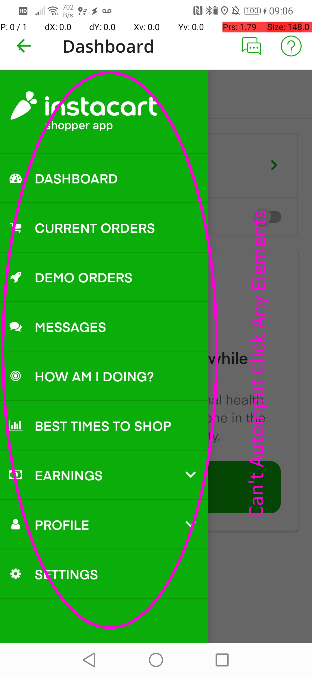 This week Instacart made a change to the app that is deliberately preventing Tasker from functioning!  It's seems to impact the Autoinput Action to "click" on items in the menu (all Actions and Field Types aren't working).  Tasker can still click on other screen areas, but nothing associated with the menu (see attachments).